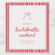 Minimalistic Script Striped Coquette Bachelorette Wine Label. A modern and elegant, striped red and white bachelorette weekend custom wine label. Personalize with the bride' name, your weekend dates, and location.