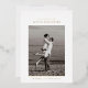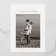 The save-the-date photocard features a single, centred photo of the couple. Above the photo, their names are displayed in a clean, modern font. A minimalistic save the date is written in foil on top of the couple's name. Below, the wedding date and location are neatly written. The design is minimal with plenty of white space, focusing on simplicity and elegance.