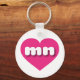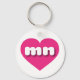 This key chain features a vibrant hot pink heart containing the bold, rounded, white lower case letters mn, a playful version of the abbreviation for the state of Minnesota, the North Star state.