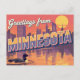 This beautiful retro-style design captures the essence of the North Star State. It features the classic "Greetings from Minnesota" typography set against a dramatic city skyline (reminiscent of Minneapolis/St. Paul) reflected in a serene lake at sunset. The foreground is anchored by the iconic Minnesota State Bird, the Common Loon, floating gracefully on the water. Perfect for fans of vintage travel posters, retro artwork, and the natural and urban beauty of the "Land of 10,000 Lakes." It makes a wonderful souvenir or gift for residents, visitors, and state enthusiasts.