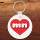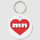 This key chain features a vibrant red heart containing the bold, white, rounded lower case letters mn, a playful abbreviation for Minnesota, the north star state.