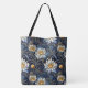 Featuring a stunning pattern of celestial white blooms against a deep, midnight blue background. The golden accents on the delicate petals and graceful stems glimmer like starlight, transforming a simple accessory into a statement piece. It’s perfect for carrying your daily essentials, whether you're heading to the market, a yoga class, or a coffee date with friends. With its durable construction and timeless design, this bag is a testament to the fact that true elegance never goes out of style.
