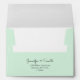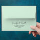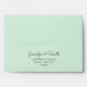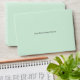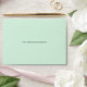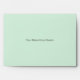 Image of a mint green envelope shown open and closed. The open envelope displays a white interior. A wooden desk holds a closed envelope alongside a decorative plant and coloured pencils. The scene conveys a minimalist and inviting tone."