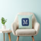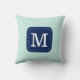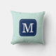 Trendy and stylish mint blue polka dots pillow with customisable monogram on navy blue banner.