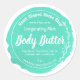 These body butter labels are mint green with a white branch like border surrounding the text.