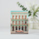 Classic picture from a typical street scene. A salmon peach old vintage car parked in front of a mint coloured colonial building in Havana Cuba