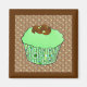 Magnet as a Cupcake with green mint frosting topped with chocolate curls, in a decorative, green fractal cupcake wrapper, on a brown and beige swirl patterned background