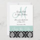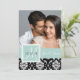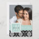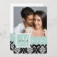 Elegant mint green accent colour with White Monogram with Black and White Vintage Damask Pattern Save the Date Flat Cards with Your Engagement Photo. Layout Design by Elke Clarke©. Graphics licensed. Customise by inserting your engagement photo, personal information and save the date message on the back. Customisable. Just click the "CUSTOMIZE" button.