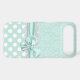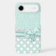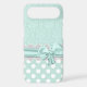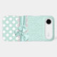 Lovely mint green and white iPhone 6 case, with a mint green on green damask pattern, on top, and a mint green with white polka dot pattern, on the bottom. Graphics of a white lace band and a mint green ribbon and bow runs across the middle between the two backgrounds. Customise to add your own text. Great way to look stylish and protect your phone at the same time.