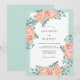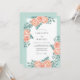 This design features a soft palette of peach and mint green, ideal for a romantic spring event. Delicate watercolor roses in shades of coral and apricot are paired with lush silver dollar eucalyptus foliage. The artwork creates a serene botanical aesthetic against a clean white backdrop.