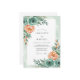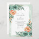 This design features a soft watercolor palette of mint green and peach. Delicate teal roses and lush peach peonies are accented by verdant eucalyptus leaves. The aesthetic evokes a serene and romantic spring atmosphere. The artwork focuses on soft painterly brushstrokes and organic floral arrangements.