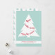 Modern graphic holiday card features a white geometric tree on a mint green background. The words "Rejoice," "make merry," and "enjoy the season" form the Christmas tree's garland in curved red script typography. Personalise it by adding your family name and first names in the sidebar. You can also add the year if you like. Your custom text will appear below the tree in red type on a white band.