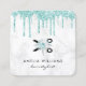 Pretty business cards for hairstylists with faux mint green glitter drips, black scissors, roses, white marble background and elegant calligraphy font.
