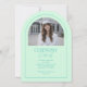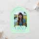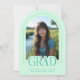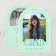 Introducing our mint green and teal arch photo graduation announcement and invitation—a sleek, modern keepsake designed with minimalist elegance. The front features an arch-shaped photo with a thin border and the word "grad" partially overlaying the photo. Personalize the template by adding your graduation year, name, and school to create your announcement with ease. On the back, upload another photo (landscape orientation is best) as well as provide graduation ceremony details. © Kimbellished, LLC