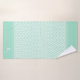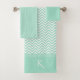 Stylish bath towel set done in mint green and white, with polka dots and chevron patterns decorating the bath towel and the hand towel. The wash cloth is done in a solid mint green. Personalise the white one letter monogram, on the bath towel to suit your needs.