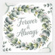 A delicate wedding greeting card featuring a beautifully detailed watercolor eucalyptus wreath rendered in shades of mint green and sage green, encircling a subtle, textured white background. The wreath incorporates scattered sprigs of baby's breath and tiny pearl-like accents, creating an elegant and slightly rustic feel, with a soft glow enhancing the watercolor effect. Across the centre of the wreath, the text “FOREVER & ALWAYS” is displayed in a flowing, modern script font in a soft silver-grey, complementing the natural tones and evoking a sense of timeless romance. The card’s interior provides ample space for a heartfelt message and incorporates a simplified eucalyptus sprig illustration in the bottom corner, maintaining the serene and celebratory emotional tone.