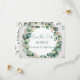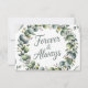 A delicate wedding greeting card featuring a beautifully detailed watercolor eucalyptus wreath rendered in shades of mint green and sage green, encircling a subtle, textured white background. The wreath incorporates scattered sprigs of baby's breath and tiny pearl-like accents, creating an elegant and slightly rustic feel, with a soft glow enhancing the watercolor effect. Across the centre of the wreath, the text “FOREVER & ALWAYS” is displayed in a flowing, modern script font in a soft silver-grey, complementing the natural tones and evoking a sense of timeless romance. The card’s interior provides ample space for a heartfelt message and incorporates a simplified eucalyptus sprig illustration in the bottom corner, maintaining the serene and celebratory emotional tone.