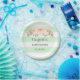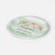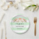 Customisable name baby shower party plates in light mint green and white stripes pattern with peach pink watercolor vintage flowers.