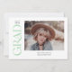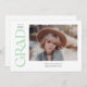 This stylish graduation announcement features the word grad in a mint green trendy serif along the left side. The front has space for a photo of the grad as well as their name, class year, and school. The back of the announcement has space for a second photo and a short message.