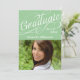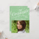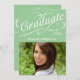 White swirly script text, whirling and curling around with "graduate", and a photo to announce the big achievement. Whimsical and fanciful cursive with the word Celebrate on the back.
