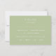 Fresh and lovely with playful elegance. This 2-sided wedding RSVP response card features a floral framed monogram and text in white against a soft green mint background. The colour is repeated at the back alongside a set of contemporary fonts in white.