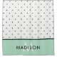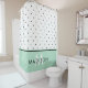 This stylish and chic shower curtain features black and white polka dots, with a bottom border in mint green. Personalise with your name and initial.