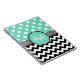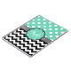 Cute, girly, trendy mint green and white polka dot pattern, black and white chevron zigzag pattern, and striped border with a floral label frame for your custom monogram and name.