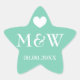 Mint green and white sea star fish monogram wedding favour stickers. Cute heart with monogrammed name initials of bride and groom plus date of marriage. Personalised thank you stickers or fancy envelope sealers / seals. Elegant stylish typography for bride and groom name initials. Cute maritime design. Customisable background colour. Romantic love icon. Starfish shaped labels for coastal / seaside beach theme wedding.