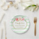 Customisable name baby shower party plates with light pastel mint green and white stripes pattern, gold details and pretty pink watercolor vintage flowers.