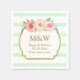 Monogram wedding napkins with light pastel mint green and white stripes pattern, vintage pink watercolor flowers and glamourous gold details. Customise these napkins with your names, monogram, and wedding date.