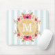 Mint Stripes Watercolor Flowers Faux Gold Monogram Mouse Mat