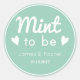 A simple design for a sticker to decorate a wedding favor. The sticker is a pale mint green with a white border, white love hearts and white text saying "Mint to be" with space for your names and your wedding date below.