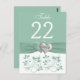 This modern and romantic mint green, white, and silver grey floral table number postcard has a sage green PRINTED ribbon and PRINTED on green and silver hearts with "LOVE" text on it that matches the wedding invitation shown below. ****You MUST change the number 22 to each of the table numbers you need, add it to your cart, and then return and repeat the process until you have all the individually numbered cards that you need in your cart. Stand it on a small easel, or in your centerpieces. If you need assistance, email niteowlstudio@gmail.com.