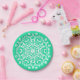 This white mandala sits on a minty green background. The colours are very relaxing and light. Part of the Mola Mandala Collection.