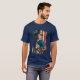 I give wanted to give this a 4 instead of a 5 because these Basic DARK T0shirts run unexpectedly SLIM or Narrow. Which is great if you do not have a potbelly, but I have a paunch. It isn't the shirt's fault that I've got a beer belly. The design and shirt itself is a quality cotton shirt. The color is more of a deep purple, but still a very pretty color. The Basic DARK T-shirts run a bit SLIMMER than the Basic Ts. The neck is a fraction narrower (or seems to be narrower) also. I'm a paunchy middle-aged woman and my neck is 12 inches (31cm) thick and the neckline fell about the same as in the photo of the man, and I had the desire to tug it a bit. So if you're a thick necked man or like loose shirts, be aware these are slimmer shirts. Once I get rid of my lockdown paunch it'll look great. The shirt washed well in cold water with no apparent bleeding. We don't have a dryer, so it hung dry. Did not shrink. Love the colors and the design. The design looks smaller on my shirt than it does on the model on-line. But still, it looks good on the shirt. The printing looks as it does on the model, just the size seems fractionally smaller. Washed garment in cold water, hung dry and design appeared unaffected.