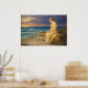 The ocean stretches out behind her in bands of deep blue and green, with small white crests rolling toward the shore. The sky dominates the scene, filled with layered clouds that shift from cool violet and slate tones to a glowing strip of gold and rose near the horizon, as if the sun is setting just out of view. Light catches Miranda’s hair and the fabric of her dress, giving her a gentle radiance against the darker sky.