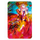 Colourful, whimsical and vibrant Venetian masquerade character. Beautiful sophisticated blonde woman is sitting with a red rose and a feathered mask in hand with sparkling gold fuchsia fabrics of a baroque masked ball costume with feathers and a dog. Watercolor painting with bright colours in ,yellow blue pink, green,gold sparkles and silver foil , inspired from characters of Comedy of Art ( Commedia dell' Arte ) , Carnival of Venice and Venetian feather masks.This cool and artistic design is also a beautiful gift for special occasions ,birthdays ,christmas, holiday,Valentine's Day,Mardi Gras ( Fat Tuesday ) season.