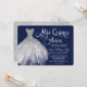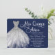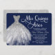 Invitacion azul oscuro y plateada de "Mis Quince Años" con vestido plateado.