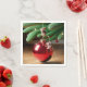 Two adorable mice are playfully perched on a shiny red Christmas ornament, which hangs from the branches of a green fir tree