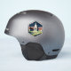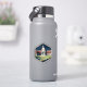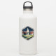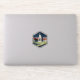 A hexagonal vintage travel badge inspired by Miskatonic University in Arkham, depicting dignified academic architecture in a classic retro travel poster style.