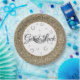 Party paper plate shown in with fun little Horseshoes, symbols of good luck surround an image of a crown, outer rim faux glitter in Gold, inner rim Golden on White background. Text in Black reads "Good Luck".