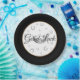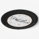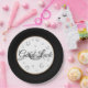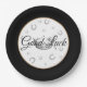 Party paper plate shown in with fun little Horseshoes, symbols of good luck surround an image of a crown, outer rim Black, inner rim Golden on White background. Text in Black reads "Good Luck".
