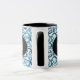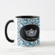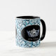 This two-tone mug has a black handle and black interior. Blue colours swirl background over white mug features ovals on each side with a very-very light steel blue pageant crown in the centre of the ovals bordered by grey. Personalised text underneath each crown for you to customise. Text sample shown in "Miss Montana".