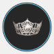 Round sticker shown with black background with a silver looking crown image. Has a splash of colour with a sky blue border. Change border colour if desired. Filter option give limited colour choices.