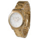 Shown in Gold coloured Stainless steel, this bracelet style watch has a White face with soft Golden numerical time markings, Golden coloured fancy scroll-work crown at 12 Noon, your Three personalised monograms and a custom text line beneath for your title, special date, etc. Has second sweep hand. Customise this item.