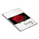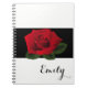Notebook shown with a photo print of a Red Rose print on a black background and a personalised name. Notebook shown in White, but choose your colour of background. Customise this item and change the name to yours or take off, or purchase as shown.