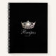 This spiral recipe notebook is shown in sleek Black with a print of a gleaming Silver crown on the cover and has great layout for your ease of adding in your own recipes. Beneath the crown is the word recipes in fancy script and the words Volume 1. Back cover in solid colour of Black with a small silver crown at bottom.