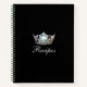 This spiral recipe notebook is shown in sleek Black with a print of a gleaming Silver crown on the cover and has great layout for your ease of adding in your own recipes. Beneath the crown is the word recipes in fancy script. Back cover in solid colour of Black with a small Silver crown at bottom.