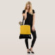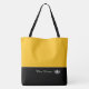This cute stylish large tote bag is shown in Saffron Yellow and black bottom colour block style with a pageant crown and custom text. Has Accent stripe.