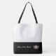This cute stylish large tote bag is shown in a classic but striking White and Black colour block style with a pageant crown and custom text.